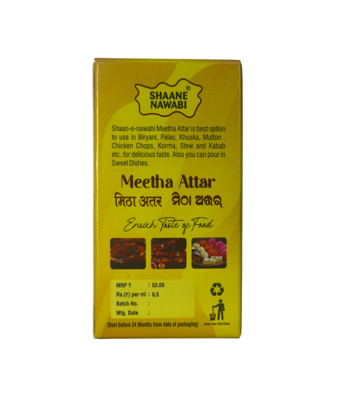 Shaan-e-nawabi meetha attar is best option to use in Biryani, Palao, Khuska, Mutton, Chicken Chops, Korma, Stew and kabab etc. For delicious taste. Also you can pour in Sweet dishes.