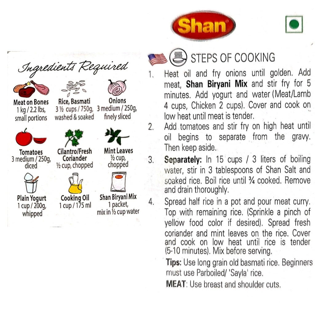 1. Heat oil and fry onions until golden. Add meat, Shan Biryani Mix and stir fry for 5 minutes. Add yogurt and water (Lamb 4 cups, Chicken 2 cups). Cover and cook on low heat until meat is tender.