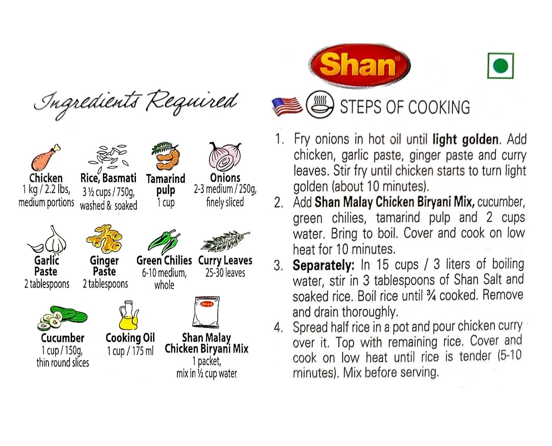 Shan Malay chicken Biryani Masala is a blend of aromatic spices carefully selected to recreate the authentic taste of biryani. It typically includes a mix of cumin, coriander, cloves, cardamom, cinnamon, and other spices, offering a balance of flavors and a rich aroma to enhance your biryani dish.